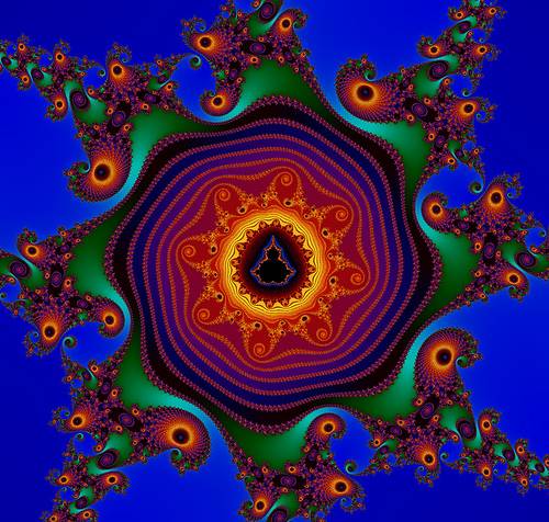 هذه صورة لتابع ماندلبرت الشهير، ومن ميِّزاته أنّه لو كبَّرن أيَّ بقعة صغيرة منه بشكل كافٍ فلا بدَّ أن يظهر منها شكل جديد يشبه الشكل الأصلي. |