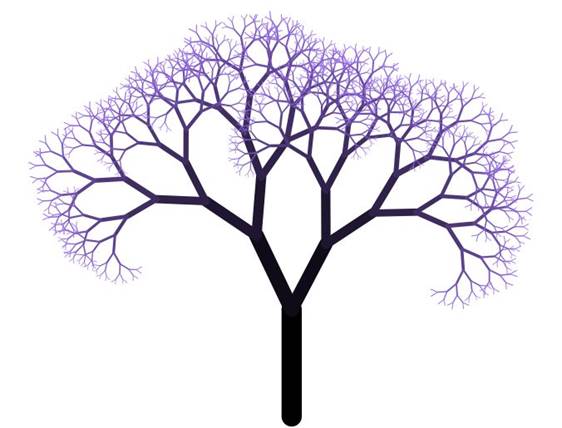 هذا الشكل يُظهر كيف تتشكّل أغصان الشجرة من تفرُّع الجزع إلى فرعين، يتفرَّع كلٌّ منهما إلى فرعين جديدين، وهكذا إلى أن نصل في النهاية إلى الأوراق بل وحتى إلى العروق الصغيرة التي في داخلها. |