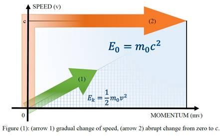 والشكل التالي يوضح استنتاج معادلة التكافؤ بين الطاقة والكتلة من نفس المعادلات التقليدية التي تُستخدم عادة لاستنتاج الطاقة الحركية، ولكن في الحالات العادية عندما يحصل التغير في السرعة في الزمن الخارجي نحصل على معادلة الطاقة الحركية العادية، وهي التي تتضمن النصف الذي ينتج من التكامل عبر الزمن، وأما في الحالة الثانية عندما يكون التغير في الزمن الداخلي فيحصل التغير بشكل آني في الزمن الخارجي، وبما أنّ الوجود في الزمن الداخلي هو وجود ميتافيزيقي فليست هناك مشكلة في الحركة الآنية لأنّ كلَّ جزء من مكوناته ليس له كتله، والكتلة تتكون من ترابط هذه الأجزاء الذي يظهر فقط على المستوى الخارجي للزمن.
