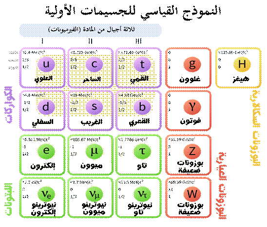 الجدول التالي يوضح ترتيب وخواص هذه الجسيمات وفق النموذج القياسي: