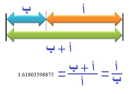 تتحدَّد النسبة الذهبية عندما تكون النسبة بين طول (أ) إلى طول (ب) تُساوي النسبة بين طول (أ+ب) إلى طول (أ)، كما هو موضح في الشكل المرفق: