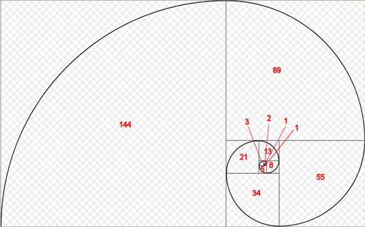 يمكن تمثيل متتالية فيبوناتشي بشكل هندسي من خلال رسم مربعات متتالية بشكل حلزوني، كما هو موضح في الشكل التالي: